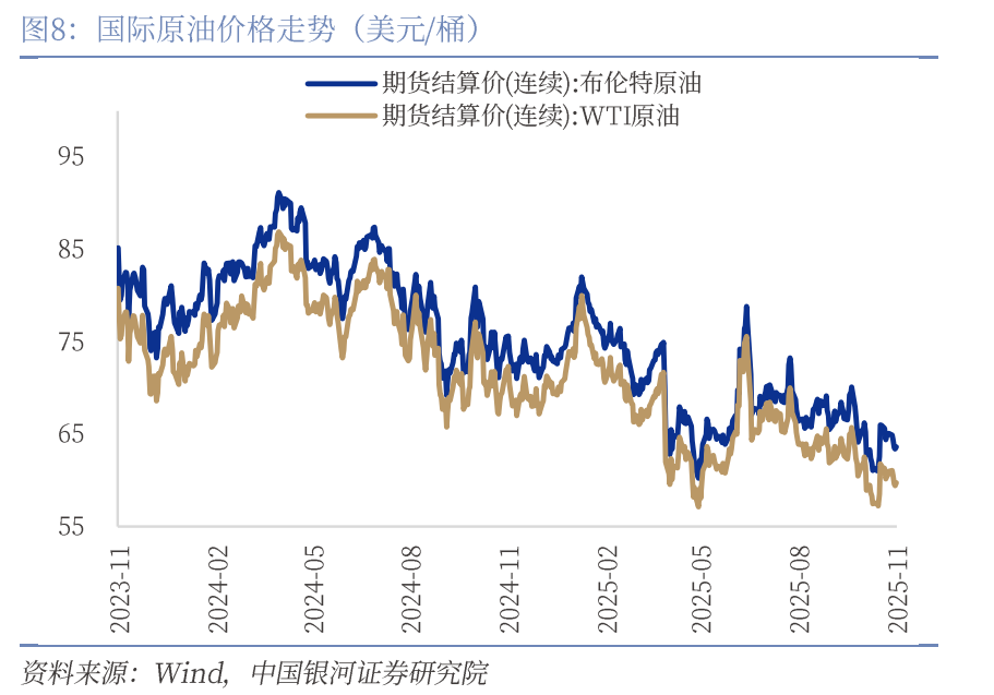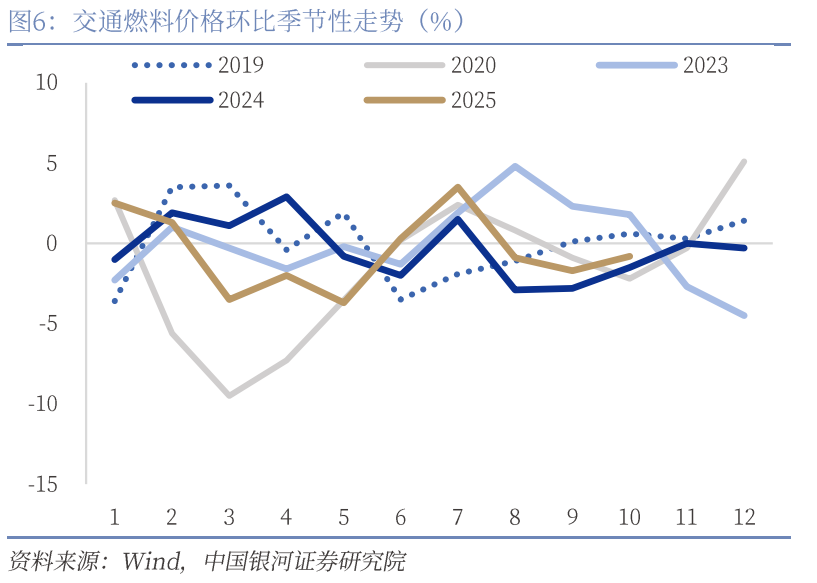第二,非食品项中旅游价格、金饰价格上涨较显著。10月非食品价格环比上涨0.2%(前值-0.1%),其中旅游价格和其他用品服务涨幅高于季节性。受中秋、国庆双节叠加影响,假期出行与休闲消费需求集中释放,旅游价格本月涨幅较高(环比2.5%,过去5年均值1.0%)。从跨区出行来看,10月国内航线日均执行航班量环比上涨2.2%(前值-11.3%);从市内交通出行景气度来看,10月份12个主要城市地铁客运环比上涨1.1%(前值-2.2%)。能源价格方面,10月布伦特原油月均价格环比下降5.4%,受国际油价变动等影响,交通工具用燃料价格环比下降0.8%,过去五年同期环比均值为0.3%。生活服务价格方面,受到国补在三季度的补贴资金出现迟滞影响,家用器具价格环比下跌0.7%(前值0.6%)。此外,其他用品和服务分项上涨较为明显3.8%(前值1.3%),其中受国际金价上涨影响,国内金饰品价格环比上涨10.2%。