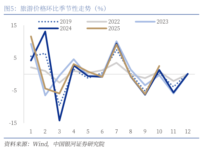 非食品项中旅游价格、金饰价格上涨较显著:10月非食品价格环比上涨0.2%(前值-0.1%),其中旅游价格和其他用品服务涨幅高于季节性。受中秋、国庆双节叠加影响,假期出行与休闲消费需求集中释放,旅游价格本月涨幅较高(环比2.5%,过去5年均值1.0%)。其他用品和服务分项上涨较为明显3.8%(前值1.3%),其中受国际金价上涨影响,国内金饰品价格环比上涨10.2%。