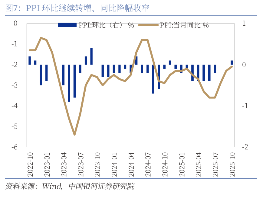 PPI环比转增、同比跌幅延续收窄:10月PPI环比上涨0.1%(前值持平),同比增速-2.1%(前值-2.3%)。反内卷政策对部分行业价格的提振改善作用仍在显现,但主要集中在上游采矿业和光伏等行业,部分中游装备制造业和下游消费品制造业仍在边际走弱。从高频数据来看,10月份工业生产数据涨跌互现,表明国内经济内生动能仍有不足。分行业来看,黑色方面,煤炭采选、煤炭加工受北方供暖需求叠加反内卷影响上行,光伏则受到上游硅料限产及成本回升、行业整合提速影响价格回升。有色方面,受到国际输入性因素以及国内产业结构升级影响,相关行业价格环比延续上涨。